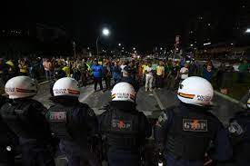 Witnesses saw Bolsonaro supporters, many in their trademark yellow national football jerseys or draped in Brazilian flags, confronting security forces on Monday night at police headquarters in Brasilia.