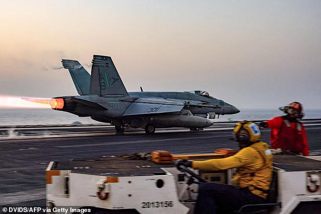 The two aviators aboard suffered minor injuries after ejecting from the failed landing, in which the aircraft failed to catch the wire, known as a ‘failed arrestment.’