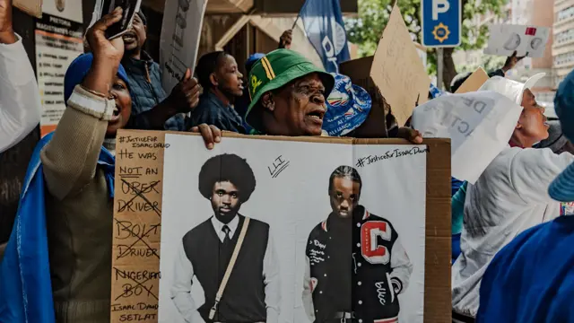 Nigerian e-hailing drivers association and concerned citizens picketed outside holding signs demanding "Justice for Isaac. Photo: EWN.